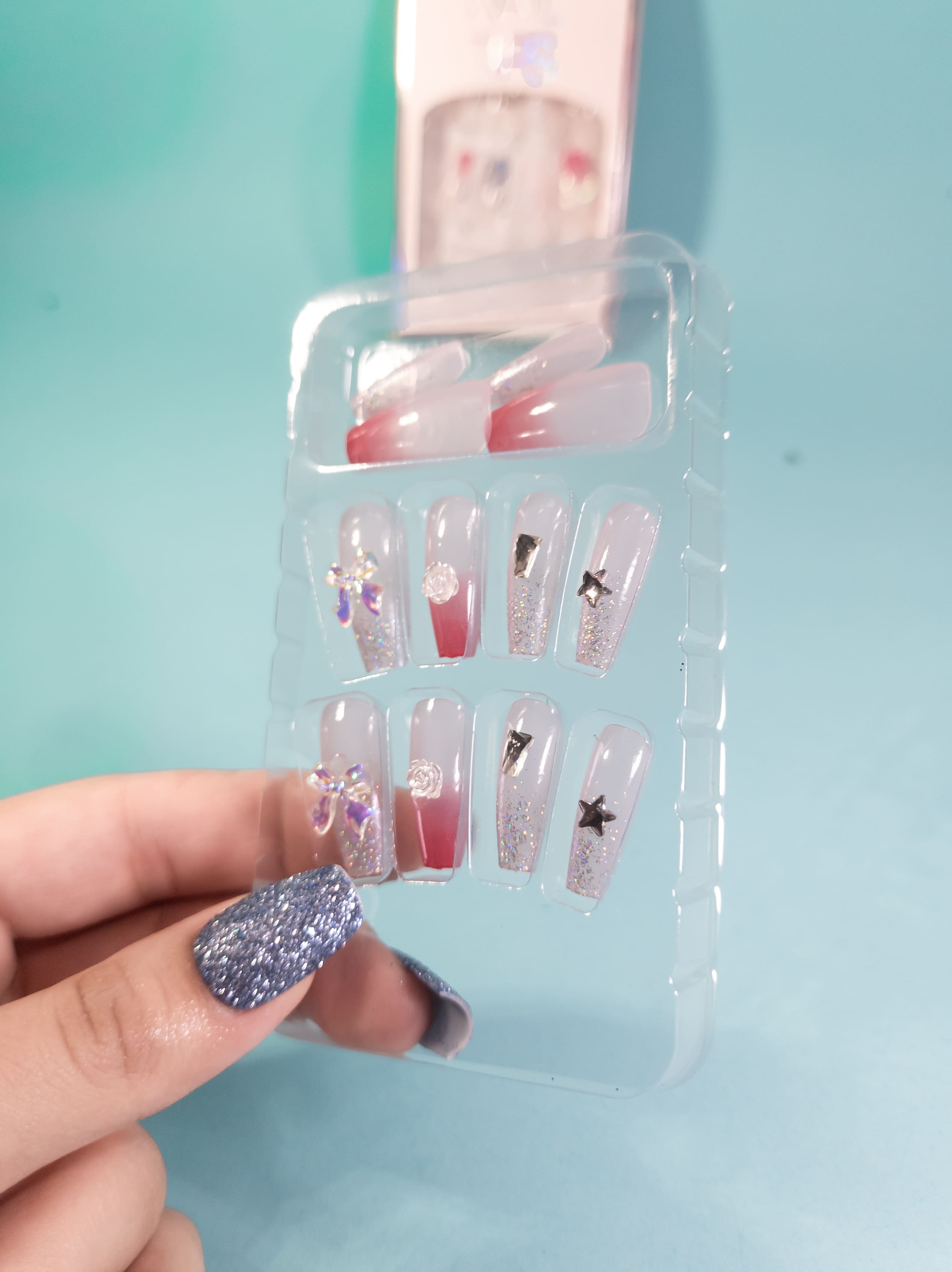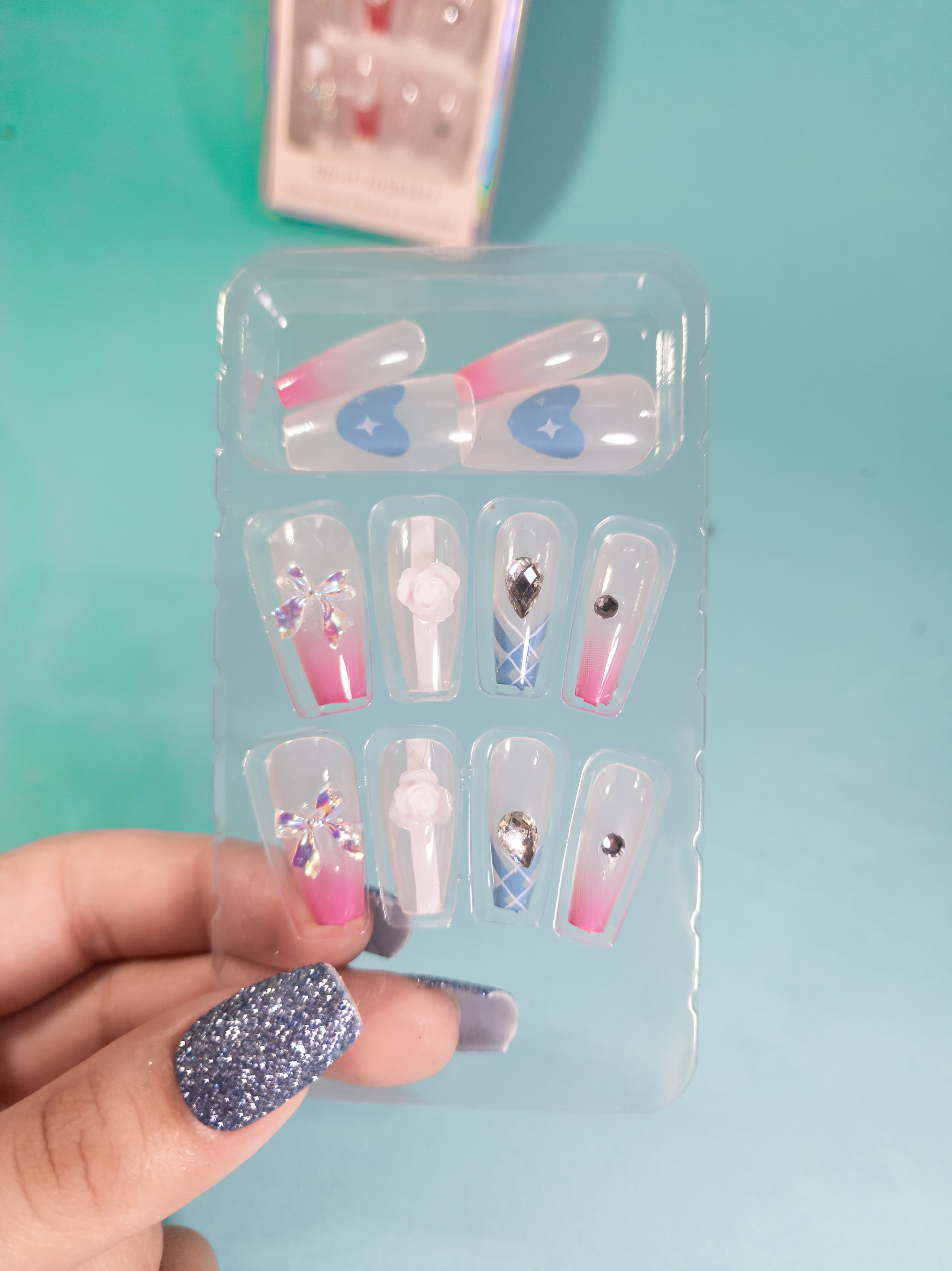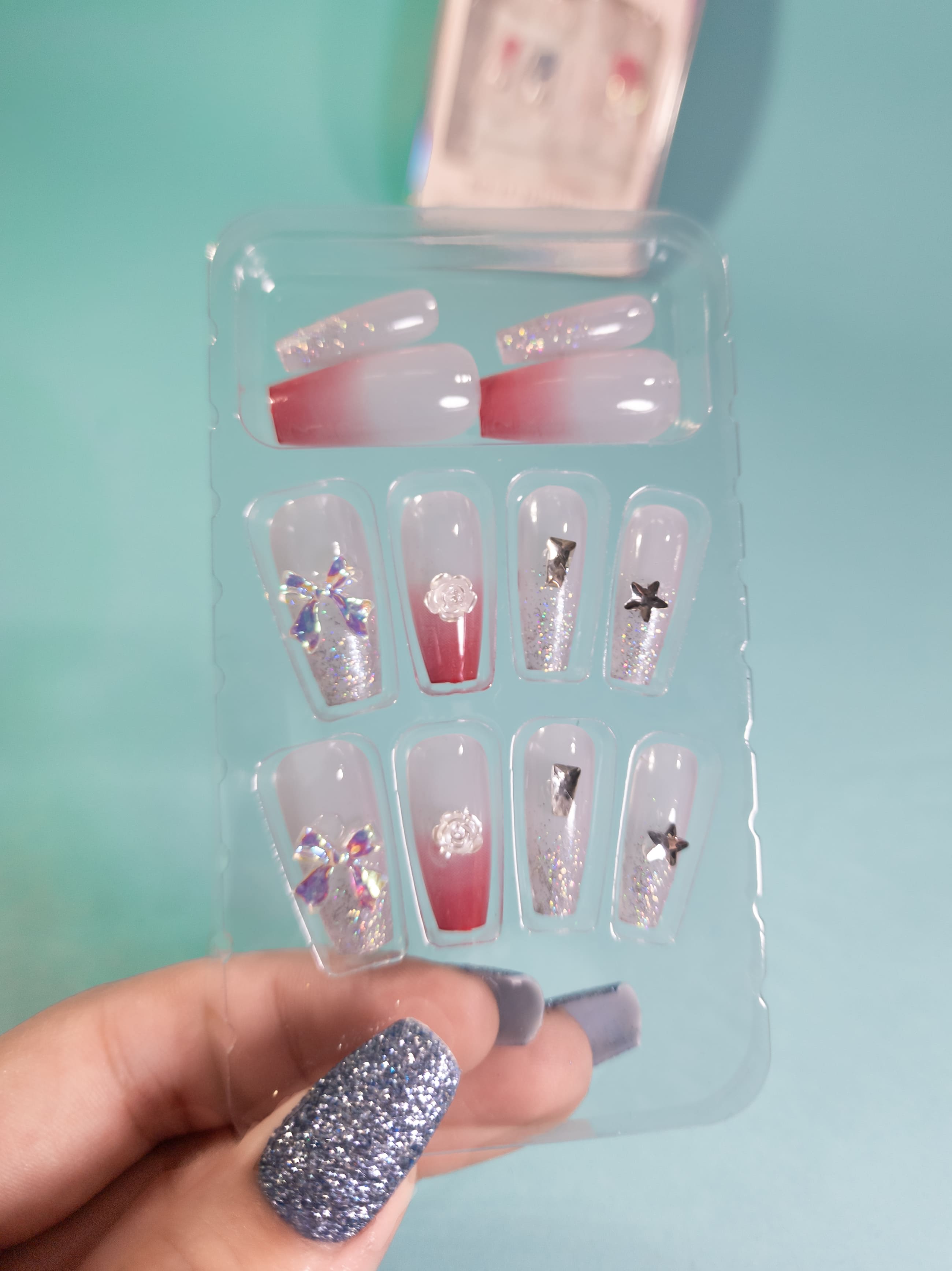 Get salon-style nails in minutes with our Charming Nail Pack.. Designed in a soft, girly style, these nails feature a glossy finish with mini decorations like bows and pearls, adding a cute yet elegant touch to your look. Lightweight, comfortable, and reusable with proper care, they’re perfect for both daily wear and special occasions.